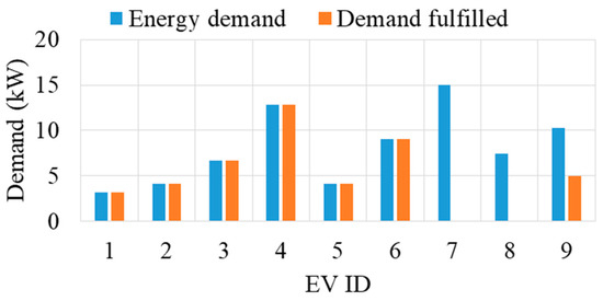 Utilizing the final rank, energy is allocated to the EVs, and the outcomes for interval 19 are depicted in Figure 9. Notably, full energy allocation is made to EVs 1–6, while partial energy fulfillment for EV 9. This allocation sequence is determined by the ranking based on the time-to-deadline and required energy ratios of the EVs. For instance, EV2 secures the top rank, and its entire energy demand is met first, followed by EV1, EV6, EV5, EV3, and EV4, in that order. Subsequently, the remaining capacity is updated after each allocation. However, despite allocating energy to EV4, the remaining capacity was insufficient to fulfill the entirety of EV9’s energy demand. Therefore, partial energy is allocated to EV9. Ultimately, no energy allocation is made for EVs 7 and 8 due to their lowest rank, as outlined in Table 1, indicating higher deadlines and comparatively greater energy demands for both EVs.