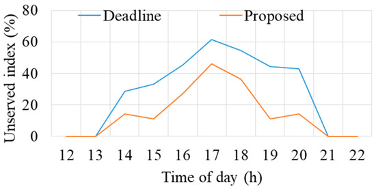 Additionally, both methods are also compared using the proposed unserved index, as shown in Figure 11. Similarly, the unserved index values consistently favor the proposed method over the earliest deadline method, showcasing lower values. During load adjustment intervals, this difference ranges from 14% to 33%, signifying the superiority of the proposed method in efficiently managing EV demand.