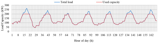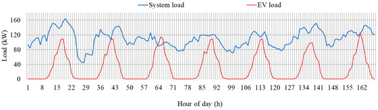 In this section, the performance of the proposed method is evaluated for seven consecutive days (a week). The purpose of this analysis is to determine the capability of the proposed method in managing the load of the network under different day types, such as weekdays and holidays. The hourly load profiles of the system and the EV fleet are shown in Figure 12. System load refers to the electric load of the transformers, excluding the load of EVs. The remaining capacity and total load of the transformer are shown in Figure 13. Total load refers to the system load and EV load. The remaining capacity refers to the capacity of the transformer after fulfilling the total load. It can be observed that the remaining capacity becomes negative during the evening hours of the day. This is due to the higher EV load coupled with higher residential load during evening hours, as shown in Figure 12.