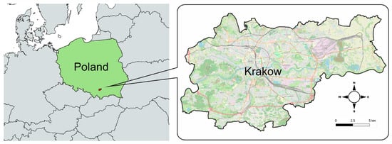 The study area is the area of Krakow (Figure 1) within the administrative boundaries of the city. Krakow is located in southern Poland, in the central-western part of the Malopolska Voivodeship, on the Vistula River. The area of the city is 326.85 km2. The average annual daily temperature is 8.7 °C and the total annual precipitation is 671.5 mm [28].