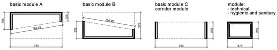 The assumptions established in the “Green Classroom” project were employed to create a geometric arrangement of at least four basic modules (Figure 2). Modules A and B feature projections of rectangular trapezoids with dimensions of 125 cm, 250 cm, and 750 cm. They are mirror images of each other. The combination of two A modules or two B modules results in the formation of a rectangle with dimensions of 750 cm by 375 cm, which provides a usable area of 23.88 m2. The base module C is a rectangle with dimensions of 750 cm × 250 cm, providing an area of 16.36 m2. An additional element is module D, with dimensions of 250 cm × 375 cm and a usable space of 7.86 m2. It is intended mainly for the construction of technical and sanitary rooms. The modules come in various spatial configurations. A total of 14 different spatial variants are available for the basic modules.