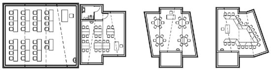 The combination of various modules allows for the creation of different configurations tailored to specific needs and user numbers (Figure 3). These modules consider the possibilities for spatial arrangements conducive to group work, discussions, presentations, and task solving on the board. It was assumed that the optimal area for each student is between 2 and 2.5 m2 for classrooms. By combining four A or B modules, a space suitable for approximately 20–26 students was obtained. In accordance with the Regulation of the Minister of National Education of 17 March 2017, regarding the detailed organisation of public schools and kindergartens, the permissible number of students in grades 1–3 is 25, with the possible exception of allowing two additional students in special situations. Consequently, for classes 1–3, the resulting room met the minimum space requirements.
