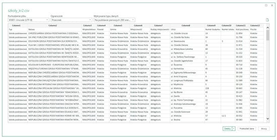 - To identify primary schools in the city of Krakow, address data provided by the Krakow Education Office [29] in the form of a .csv database (Figure 4) were used.