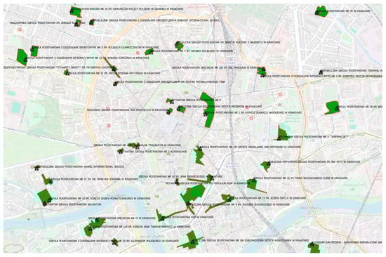 A spatial analysis of 206 primary schools in the city of Krakow identified 190 areas of potential locations for “Green Classrooms” (Table 2). This was achieved by identifying plots on which land cover and land use areas were located (Figure 7). Subsequently, areas occupied by other objects on the plots were excluded, resulting in 279 potential locations for “Green Classroom” objects (Examples of locations in Figure 8). A total of 46 areas were rejected due to the minimum area and optimal module dimensions criteria, which consequently excluded five primary schools. It should be noted that the impact of the provisions of local spatial development plans, which could further limit the potential locations, was not included in the presented research. It is important to note that the parameters established in the Local Development Plans (MPZP) may be included at any stage of the analysis, which will narrow the implementation possibilities in individual locations and thus limit the size of the research sample.