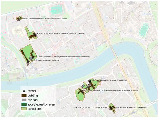 - Geokodowanie Adresów UUG GUGiK—The plugin Geocodes addresses for Poland in CSV file format. It uses UUG GUGiK web service (plugins.qgis.org/plugins/geokodowanie_adresow/, accessed on 18 January 2024). The locations of primary schools in Krakow were determined on the basis of primary school addresses obtained from the database of the Education Office in Krakow.