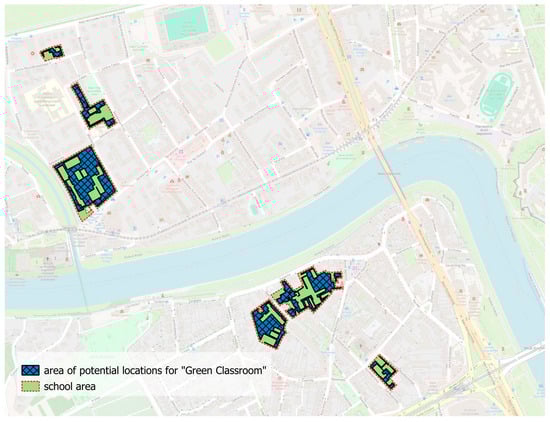 - Using the Processing plugin of the QGIS software, the potential areas for the location of “Green Classrooms” were determined (Figure 8), taking into account the optimal dimensions of the designed modular objects and the minimum distance from the plot boundary (4 m). The majority of regulations pertaining to the development of land properties in Poland originate from the provisions of the Construction Law and from local development plans, if any are in force in a given area.