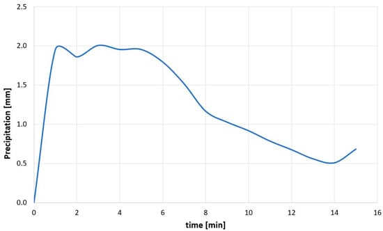 The following precipitation distribution was assumed for the calculation: duration 15 min, probability of occurrence 20% (once in 5 years), typical for the study area (the city of Krakow) according to Krakow WATER (Figure 10).