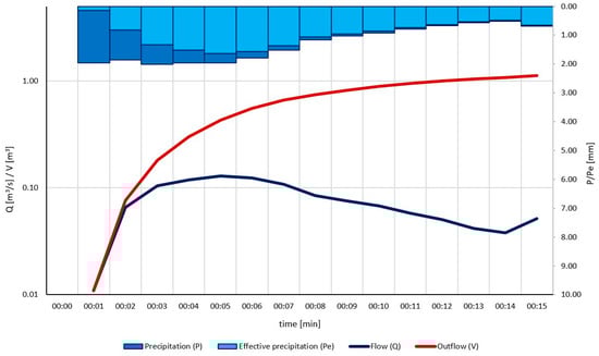 Stormwater runoff was calculated for all potential “Green Classroom” locations, taking into account land cover and land use. Figure 12 shows an example of a runoff hydrograph from the roof of a modular Green Classroom building with an area of 78.84 m2. Precipitation is the typical distribution of 15 min precipitation for the area of the city of Krakow according to data made available by Krakow WATER, for which effective precipitation has been defined. Effective precipitation was used to determine flow from the roof of the “Green Classroom” building. Outflow is the sum of flow over time.