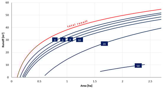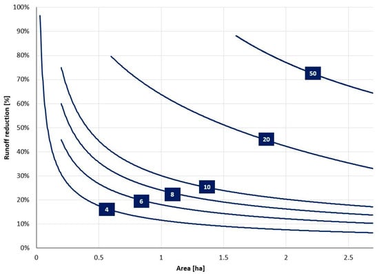 Nomograms have been drawn up for the city of Krakow based on local data (typical rainfall and hydrometeorological conditions, soil type, and land use and available areas for the potential location of “Green Classrooms”). This is not a universal solution—it can only serve as a pattern to develop similar solutions for other areas. The development of a nomogram (for the city of Krakow) for the degree of runoff volume reduction depending on the area (Figure 14 enabled the factors determining the size of the stormwater retention reservoir for primary school areas in the city of Krakow to be taken into account. This nomogram takes into account a typical 15 min precipitation distribution for the city of Krakow. Nomograms of a similar nature can be developed for different precipitation scenarios.