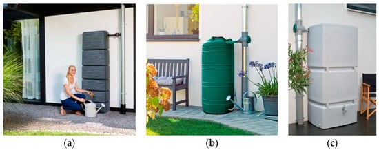 Examples of aboveground stormwater tanks: (a) Slim Stone tank manufactured by Ecodren, (b) VERDE tank manufactured by Impet, and (c) JUMBO tank manufactured by Hydromil.