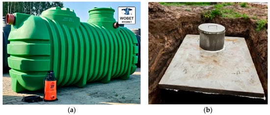 Examples of underground stormwater tanks: (a) plastic tank, manufactured by WOBET HYDRET, and (b) concrete reservoir, manufactured by BE-TON TANKS.