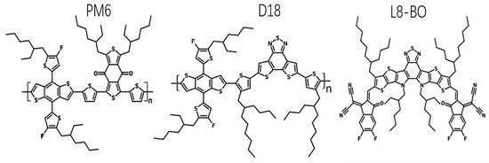 Figure 3 displays the chemical architectures and wavelength of the materials employed. L8-BO predominantly absorbs photons from 550 to 900 nm [46]. PM6 and D18 serve as a means to capture photons with short wavelengths ranging from 400 to 700 nm [46]. Additionally, this combination facilitates the manipulation of material crystallization processes, resulting in the formation of a donor phase characterized by high-quality crystalline properties.