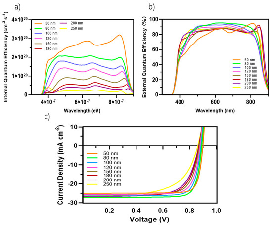 These parameters are directly affected by several factors, including photon absorption, exciton generation and diffusion, dissociation, transport, and the collection of charge carriers by the electrodes. Figure 5 and Figure 6 display the distribution of the incident photon and absorbed photon spectra, respectively. The observed EQE curve in Figure 4b demonstrates a significant absorption of incident photons from 530 nm to 810 nm. This range is particularly important due to the presence of a crucial photon density localized between 350 nm and 880 nm. For the optimal thickness of the active blend (80 nm), the absorption of light is approximately 90%, accompanied by an average generation rate of 2 × 1020 cm−3 s−1.