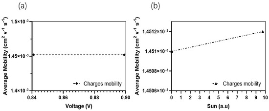 Charges carrier mobilities for the optimal device. (a) Charges carrier mobility in the function of suns (a.u.); (b) Charges carrier mobility in the function of Voc.