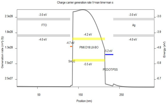 In addition, we observe from Figure 9 an important generation rate in the LUMO of the donor side of 2.55 × 1028 m−3 and cascading energy levels between the LUMO of the donor and the LUMO of SnO2 to create a passage toward the electrodes for electron transfer. The high Voc attained by our device can be attributed, in some manner, to the strong level of energy, and its high value is a result of efficient electron transfer. SnO2 is compatible with our structure due to its crystallinity, high electron mobility, and conductivity, and it has proven its efficiency in several studies [36,37,38].
