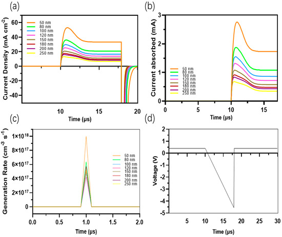 (a) Transient current density for the different mobilities of the thicknesses of the active layers of different devices; (b) transient current for the different mobilities for all devices; (c) transient generation rate for all devices; and (d) transient voltage for different mobilities for all devices.