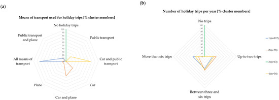 The four clusters of interview applicants (N = 219, each line represents a cluster): (a) based on the transport modes used for holiday travel; (b) based on the number of holiday travels per year.