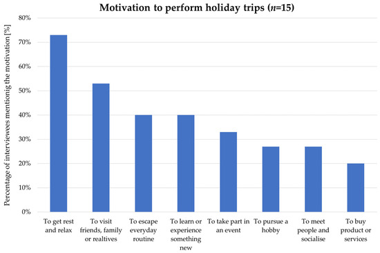 The motivations for holiday-making emerging from the interviews (open questions in which the interviewees were invited to freely mention one or more reasons why they like to take holidays) are summarised in Figure 2 by using the same categories already used in the literature [44] to allow comparisons with their results. The most frequently cited motivation deals with the opportunity to get rest and relax oneself. However, our interviews suggest that people tend not to be driven by a single motivation, as they frequently organise their holidays to enjoy a combination of relaxation, experiencing new places, activities, and events, and socialisation opportunities.