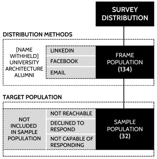 The target population was identified from previous graduate registers and targeted for participation using the public domain (Figure 1). Survey distribution composed three main methods, including (1) email distribution to alumni from [Name withheld] University’s inaugural architecture program, (2) the use of social media (Facebook) to advertise on an alumni forum, and (3) the use of social media (LinkedIn) to contact users self-identifying as having graduated from the [Name withheld] architecture program since 2014.