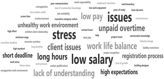 The second emerging theme from the literature is how the architect’s changing role contributes to factors such as stress, pressure and risk, negatively affecting employee wellbeing. Within the role of the architect, certain elements, such as creative license in the project process, are unique and often highly valued by the employee []. However, these elements also lead to higher levels of project-induced stress [], contributing to 12% of participants indicating intentions to exit architecture for this reason.
