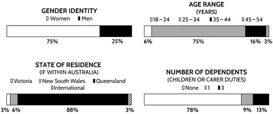 Most participants were female (75%), living in Queensland and 35 years old or younger (81%), indicating a distribution of professionals relatively early in the career pipeline. Less than a quarter of women had dependents (12%), compared to a smaller percentage of men (9%) (Figure 3).