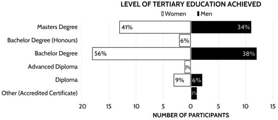 Considering the target population of architecture alumni, all participants (100%) had conferred a bachelor’s degree, while most (75%) continued architectural education to the master’s level (Figure 4). A single participant (3%) had achieved additional qualifications in construction. As explained in the literature review, certain levels of tertiary education directly correlate with official job titles and can be considered indicative of partial registration eligibility. Table 1 identifies the current employment status, job title within the industry and current registration status or intention for architectural registration. ‘R’ refers to singular respondents, in which women are shown in red text and men are shown in black text.