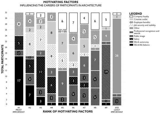 Participants were asked to rank the factors that most motivate their career in architecture (Figure 5) using a predetermined list of 10 common workplace motivators specific to architecture, as described in the conceptual framework.