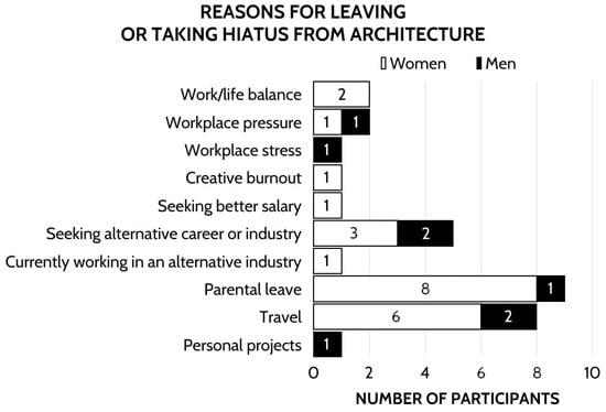 Although multiple studies report difficulties for professionals within construction and architecture to successfully balance sustainable work/family relationships [], none of the participants indicated parenthood or family stressors as a specific demotivating career factor. This conflicts with the existing literature, which identifies work/family balance as a critical stressor, particularly for women []. However, on the intention of leave or hiatus, a quarter of participants indicated to be taking leave from architecture for parenthood specifically. Given this discrepancy, the cautionary simplification that issues of work/life balance do not impact career demotivators in the reviewed population speaks rather to the nature of survey design and scope. Open-ended questions without more specific prompts can result in broad data. Through this study and within hiatus investigations specifically, amendments to this methodology must provide more specific prompts to increase the specificity of participant answers.