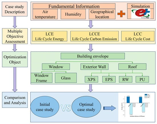 This study analyzes energy-saving strategies for student dormitory buildings of hot summer and cold winter regions in China. The research evaluates the impact of optimizing the building envelope by using a multi-criteria assessment method that incorporates life cycle energy (LCE), life cycle carbon emissions (LCCE), and life cycle costs (LCC). The model is applied to external walls, roofs, and windows to identify the optimal materials and thicknesses. The study compares the energy performance of retrofitted and original buildings, providing a reference for dormitory renovations in similar climates. All calculation processes are supported by formulas and national standards to ensure the accuracy of the simulation and the reliability of the results. The research flowchart is depicted in Figure 1.