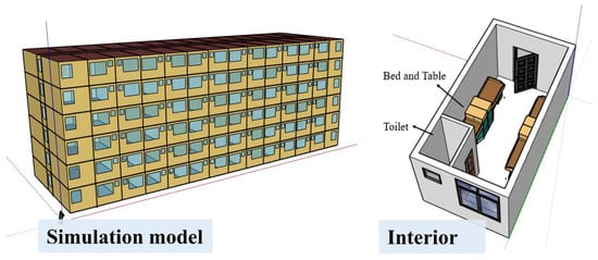Building energy modeling (BEM) is a highly effective tool for evaluating the energy performance of buildings [47]. This study used EnergyPlus, a widely used building energy simulation engine developed by the U.S. Department of Energy (DOE) and Lawrence Berkeley National Laboratory (LBNL), to simulate the energy consumption of the case study building [48]. The dormitory simulation diagram and the dormitory unit interior diagram are shown in Figure 6. The construction of the exterior envelope and heat conduction coefficient of the case study building are shown in Table 2.