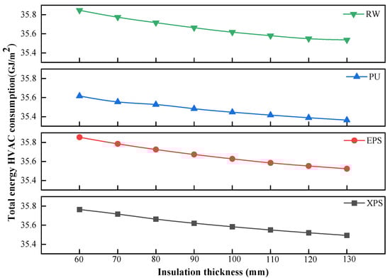 Based on the case study, this section employs a multi-criteria assessment model to meet the energy-saving retrofit measures by adding different insulation materials to the external walls individually. Considering the requirements of energy-saving regulations, different insulation materials have different thickness ranges. A common material range (60–130 mm) was selected for comparison. Figure 7 presents the variation curves of the unit area annual total energy HVAC consumption for different thicknesses of the same material and for the same thickness with different materials added.