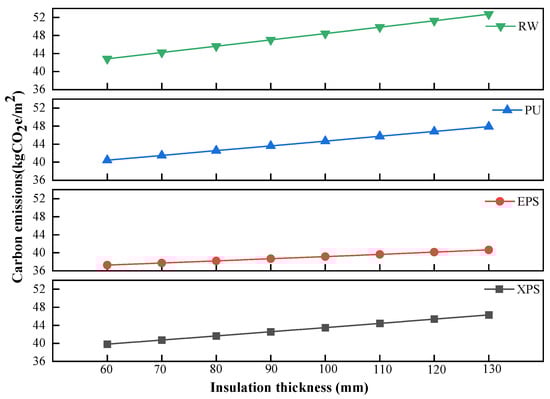 Figure 8 illustrates that, as the thickness of the insulation material increases, the cost per unit area of the building also increases accordingly. The total cost of the building is the cumulative sum of the energy consumption cost and the material cost. Taking XPS as an example, starting from 60 mm, the cost increases for every additional 10 mm of material thickness are 24.06%, 28.13%, 32.17%, 36.25%, 40.34%, 44.44%, 48.55%, and 52.66%, respectively. The main reason is that, while the addition of insulation materials decreases the building’s overall energy consumption, it does not significantly improve the already relatively sound original construction of the building envelope. This means that the existing building envelope is already effective at energy conservation. After increasing the thickness of the insulation material, the increase in material cost outweighs the decrease in energy consumption cost, leading to a gradual increase in total cost. It can be observed that the order of cost increase for different materials after changes in the insulation layer thickness is PU > RW > XPS > EPS. Therefore, when designing for energy consumption in buildings, it is nonnegligible to consider that the choice of insulation materials is also subject to economic constraints, and a balanced analysis should be conducted based on different practical situations.