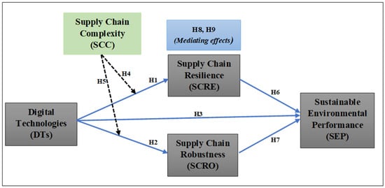 Finally, IPT suggests that supply chains rely not only on their internal capabilities but also on their trading partners. This dependency introduces a level of unpredictability and lack of control over factors such as product quality and delivery performance of suppliers [,,]. The risks and uncertainties arise from the growing supply chain complexities, which can be attributed to variables such as suppliers’ engineering skills, manufacturing lead times, performance, product quality, and pricing []. These uncertainties complicate decision-making processes and heighten the need for new and additional information [,]. Therefore, IPT is applicable in elucidating information processing importance for supply chain effectiveness, including SCRE, SCRO, and SCC [,,]. However, the specific role of DTs in enhancing information capabilities and, in turn, impacting sustainable environmental performance (SEP) has not been directly addressed, which is the focus of this study.