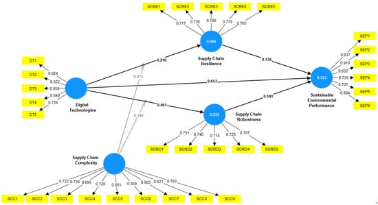 Similarly, DTs enhance sustainable environmental performance (SEP) (β = 0.653; t-value = 13.750), supporting hypothesis H3. Additionally, we examined the effects of SCRE and SCRO on SEP. It was found that SCRE positively and significantly impacts the SEP (β = 0.136; t-value = 2.380) and SCRO (β = 0.141; t-value = 2.077) significantly and positively impact SEP. As a result, the study accepts H6 and H7. These findings align with previous studies [,,,,,,,,] that demonstrated the capability of digital technologies (DTs) to offer remote storage for real-time operational data and enable on-demand access to this data through cloud technology []. This facilitates seamless sharing, unhindered flow, instant utilization, and efficient distribution of manufacturing information, leading to a significant improvement in operational effectiveness. Furthermore, these findings validate the theoretical assertions of IPT that DTs can enhance a company’s information processing ability, thus supporting decision making in operations and environmental management, ultimately enhancing economic and environmental performance. Consequently, DTs play a crucial role in production scheduling and control, resulting in improved operational efficiency, cost savings, higher profits, and sustainability [,].