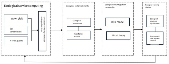 By identifying the importance of regional ecosystem services in urban and rural areas, highly important areas providing ecosystem services were designated as regional ecological service sources based on hotspot analysis, and assessments were conducted based on the size of the ecological source areas in each region. Additionally, a minimum resistance model was established to identify the ecological corridor in this region, which was then optimized using circuit theory to obtain the ecological security pattern for urban and rural areas. Based on this security pattern, the importance of the influencing factors was analyzed using a neural network. The resistance surface impact factors were then adjusted (either supplemented, reduced, or corrected) based on different needs, thereby establishing the ecological security pattern for different scenarios in a cycle. The establishment of an ecological security pattern on the scale of urban and rural areas can guide the optimization of ecological–production–living space and the governance of the mountain–river–forest–field–lake–grassland system in the study area. This approach provides key insights into the importance of ecosystem service functions and ecological functions, thus enabling their management (Figure 2).