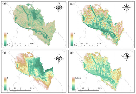 Ecosystem service function importance assessment for ecosystem services 3. (a) represents water yield, (b) represents habitat quality, (c) represents soil conservation, and (d) symbolizes the result weighted by the importance of ecological services.)