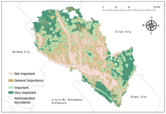 The importance assessment of the ecosystem was further graded, categorizing the overall function of the study area into four levels: not important, less important, important, and very important. Upon grading, our findings revealed that the ecological importance of the study area in the northeast increased compared to the evaluation based solely on individual functions. The area categorized as a ‘very important’ ecological source area had a coverage of 24.9% (Figure 5).