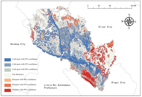 Based on the results of the InVEST evaluation and the analytic hierarchy process, we assessed the importance and resistance surface of ecological services. The ecological source area was extracted using hotspot analysis. The process is described in the equations below: