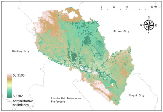 In Equations (2)–(4), PETxi is the annual mean potential evapotranspiration (mm) on grid x when the land use type is i; Wx is the non-physical parameter of soil properties in natural climate; AWCx is the effective soil moisture content of grid x (mm); and Z is the tensor coefficient, a seasonal constant with values ranging from 1 to 30. By analyzing data from hydrology stations and the related literature [22] in the study area, this study continuously adjusts the tensor coefficient to achieve the optimal evaluation result. This optimal evaluation result represents one of the basic conditions for evaluating ecological importance.