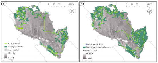 Corridor optimization based on MCR model. (a) shows the ecological corridor before the optimization, and (b) shows the optimized ecological corridor.