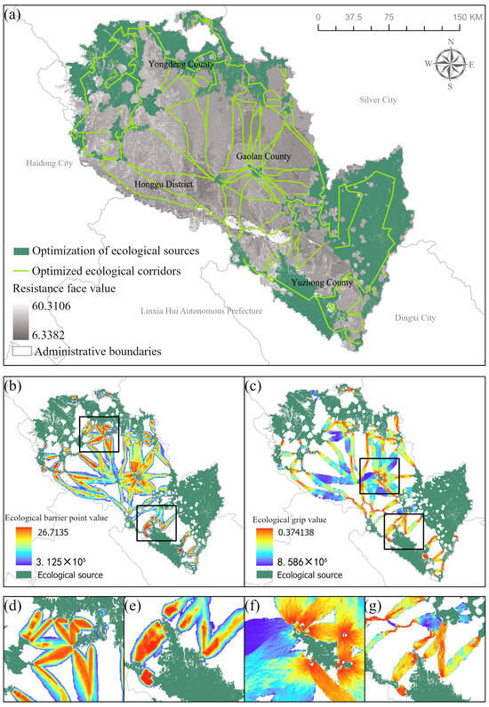 Ecological security pattern optimized based on circuit theory.(a) represents the optimized ecological corridor; (b) represents the ecological barrier point; (c) represents the ecological grip point; (d–g) represent the key areas.