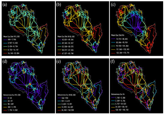 Corridor space syntax analysis under different analysis radii 5. (a–c) represent MED at different analysis radii; (d–f) represent BTE at different analysis radii.