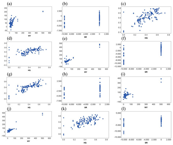 Figure 11 presents a scatter plot of the actual and predicted values of each variable, indicating that the model fit was better under bivariate conditions, followed by trivariate conditions, and, finally, single-dependent-variable conditions. The simulation level was poor when soil conservation was involved, whereas the model fit was high when water yield and habitat quality were involved.