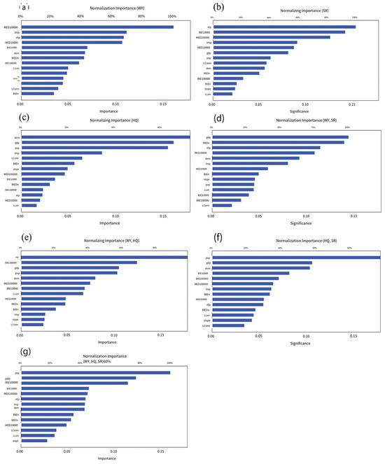 Importance analysis of neural networks. (a–c) represent the effects of water yield, soil retention, and habitat quality; (d–f) represent the effects of water yield and soil retention, water yield and habitat quality, habitat quality, and soil retention; (g) indicates the effects of three functions.