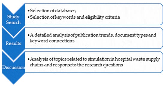The main objective of this work is to systematically analyze the literature on hybrid simulation in hospital waste supply chains in the context of Industry 4.0. A systematic literature review is a process that allows the collection of scientific publications on a given topic that can answer the research questions posed and that fit certain selection criteria []. Bibliometric analysis is a methodology that explores and analyzes substantial amounts of scientific data and whose importance has increased in recent years due to the advancement and availability of bibliometric software, as well as the interaction between different areas of bibliometric methodology [].