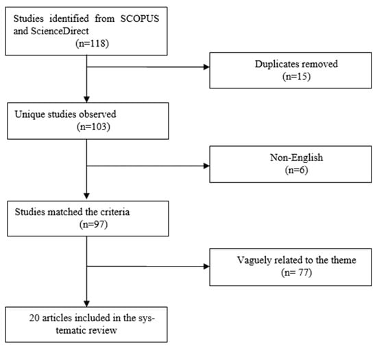 The database search with these criteria resulted in 118 articles (97 in Scopus and 21 in ScienceDirect). Then, 15 repeated publications were removed, resulting in 103 documents. This was followed by the removal of six non-English documents and 77 other articles that were not suitable for the purpose of this research. The final result of the search was 20 articles since 2010. Figure 2 summarizes the results and the number of publications at each phase.