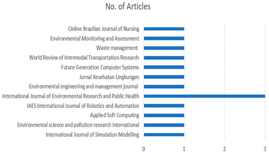 With regard to the journal in which the studies were published, the International Journal of Environmental Research and Public Health had the highest number of publications (three publications). The remaining journals had one publication. Figure 5 below presents the number of articles per journal.