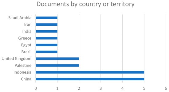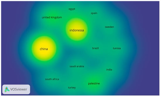 China and Indonesia are the countries that have conducted the most studies on the subject of the article, with five documents each. The United Kingdom and Palestine are next, with two documents each. Figure 6 displays the number of documents per top 10 country/territory. Figure 7 illustrates the density of the countries that contribute most to publications on this topic using VOS viewer software. It should be noted that the higher the density of countries, the more publications there will be.