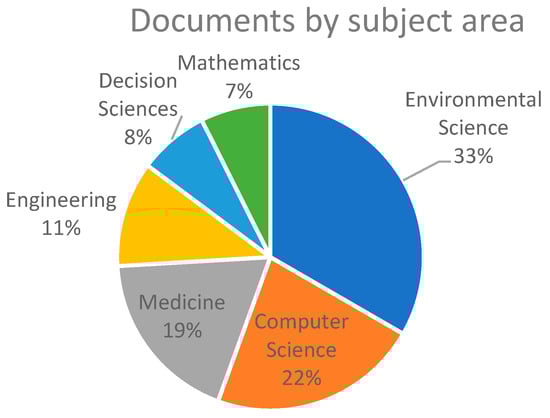 Figure 8 provides a summary of the number of documents per area of work. It should be emphasized that only topics with more than one document were selected for this analysis. It should be emphasized that around 33% of the documents are in the field of environmental science and 22% are in computer science.