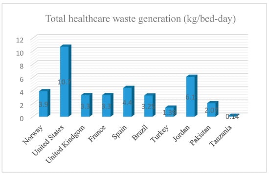 Figure 12 also shows that the country with the highest production of medical waste is the United States, with 10.7 kg/bed-day, while the lowest value is found in Tanzania, with only 0.14 kg/bed-day.